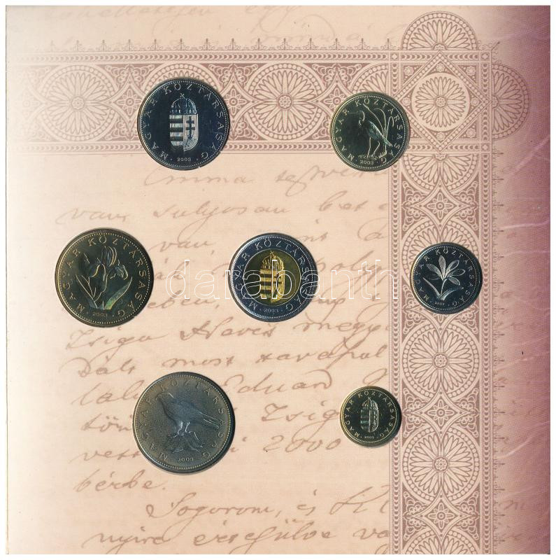 2003. 1Ft-100Ft (7xklf) forgalmi sor szettben + 20Ft "Deák Ferenc" forgalmi emlékérme, belső tok ragasztása kissé elengedett T:BU kis patina / Hungary 2003. 1 Forint - 100 Forint (7xdiff) in coin set + 20 Forint "Ferenc Deák" commemorative coin, the gluing of the inner case is a little loose C:BU Adamo FO36