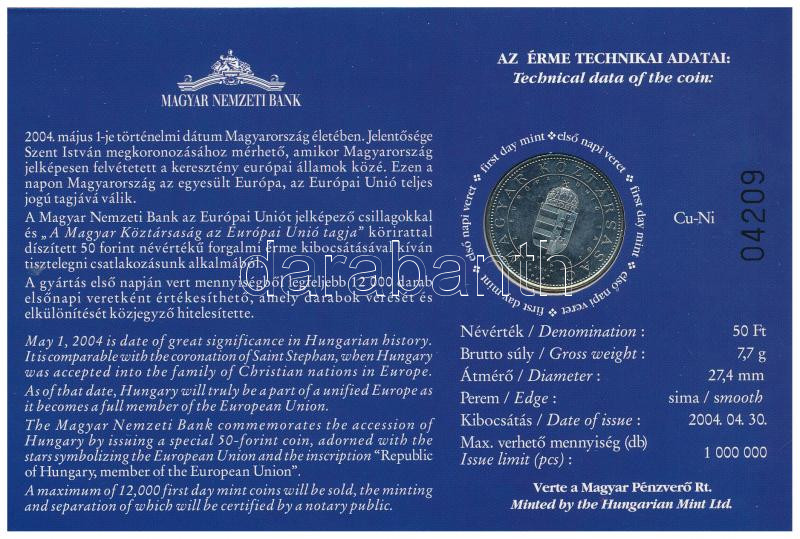 2004. 50Ft Cu-Ni "A Magyar Köztársaság az Európai Unió tagja"... https://www.darabanth.com/de/432-Fernauktion/432.0/Numismatik/Ungarische-Munzen-und-Munzen-mit-ungarischem-Munzzeichen~1500008/2004-50Ft-Cu-Ni-A-Magyar-Koztarsasag-az-Europai-Unio-tagja-elso-napi-veret-sorszamozott-~II2782601