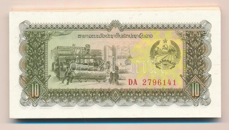 Laosz DN (1979-1988) 10 Kip (61x) consecutive serials with damaged currency strap C:UNC,AU