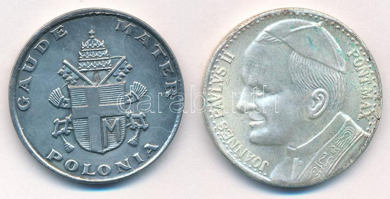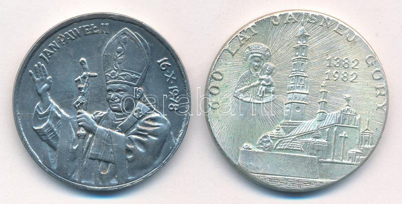 Lengyelország1978. "II. János Pál" kétoldalas fém emlékérem (35mm) + 1982. "600 éves a Jasna Góra-i pálos kolostor / II. János Pál pápa" kétoldalas, ezüstözött fém emlékérem (35mm) T:2 patina, kopott ezüstözés Poland 1978. "Pope John Paul II" two-sided metal commemorative medallion (35mm) + 1982. "600th Anniversary of Jasnej Gory / Pope John Paul II" two-sided, silver-plated metal commemorative medallion (35mm) C:XF patina, worn silver plating