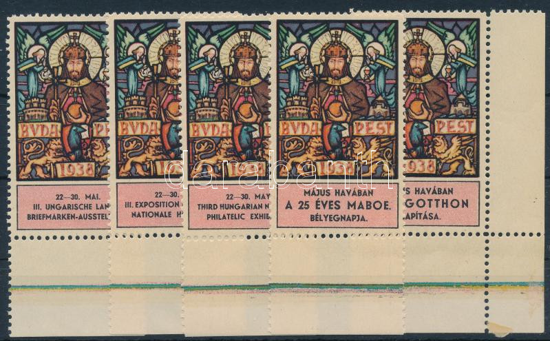 Beschreibung: 1938 Szent István emlékév - III. Nemzeti Bélyegkiállítás, MABOE Jubileum, rózsaszín, 5 db különféle levélzáró