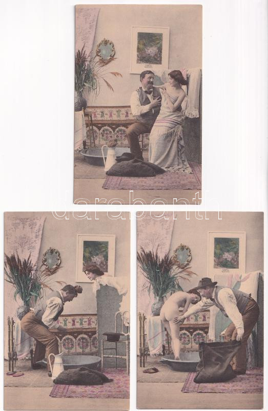 Beschreibung: Erotikus képeslap sorozat - 5 db régi hosszú címzéses képeslap meztelen hölggyel / Erotic postcard series - 5 pre-1905 erotic postcards with nude lady