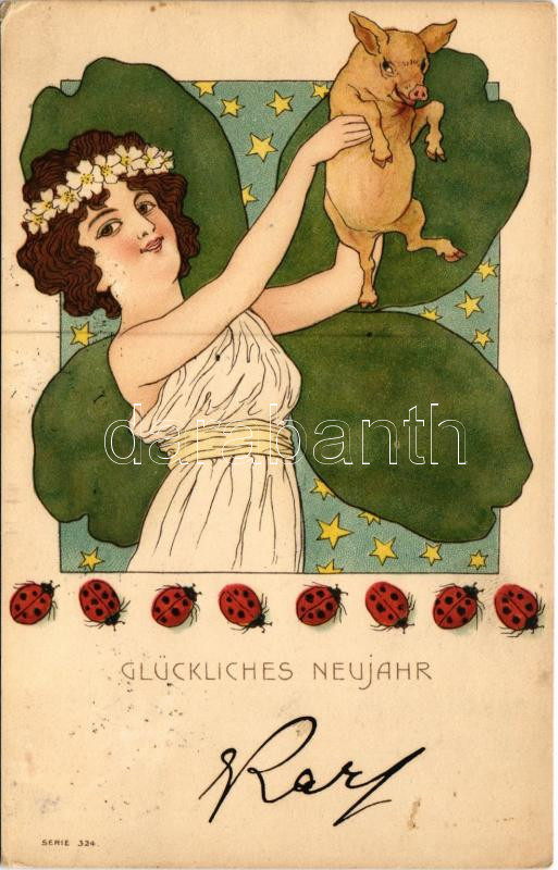 Beschreibung: 1899 (Vorläufer) Glückliches Neujahr! / New Year greeting art postcard with Art Nouveau lady and pig. litho (EK)