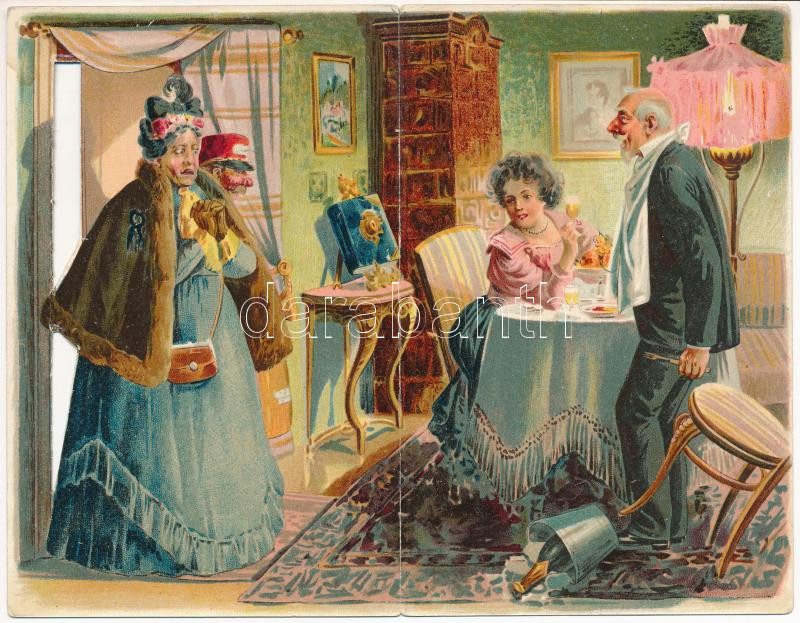Humoros kinyitható litho képeslap hűtlen házaspárokkal / Humorous folding litho art postcard with cheating husband and wife (hajtásnál szakadt / torn at fold)