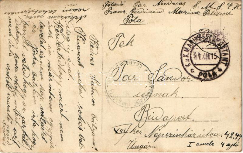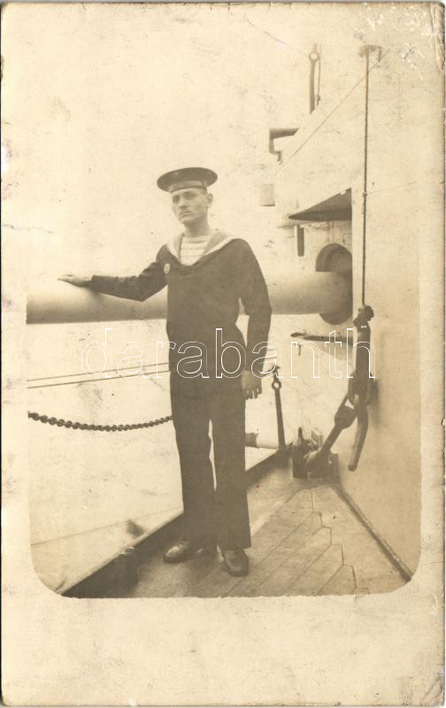 1915 Pola, Pula; SMS Erzherzog Franz Ferdinand Osztrák-Magyar Haditengerészet Radetzky-osztályú csatahajójának matróza ágyúcső mellett / K.u.K. Kriegsmarine Matrose / WWI Austro-Hungarian Navy mariner of SMS Erzherzog Franz Ferdinand. photo (EK)