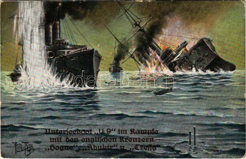 1915 SM Unterseeboot "U 9" im Kampfe mit den englischen Kreuzern "Hogue", "Aboukir" u. "Cressy" / A tengeralatti "U9" harcban a "Hogue", "Abukir" és "Cressy" angol cirkálókkal / WWI Imperial German Navy (Kaiserliche Marine) art postcard, U-9 submarine sinks 3 English armored cruisers. L&P 1712. s: Arthur Thiele (EK)