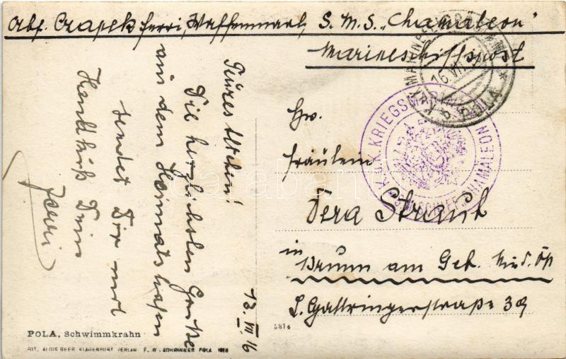 Beschreibung: 1916 Pola, Pula; Schwimmkrahn / Óriás úszódaru a hajógyárban / WWI Austro-Hungarian Navy, K.u.K. Kriegsmarine, giant floating crane at the shipyard. Fot. Alois Beer. Verlag F. W. Schrinner + "K.u.K. Kriegsmarine SM SCHIFF CHAMÄLEON" (EK)