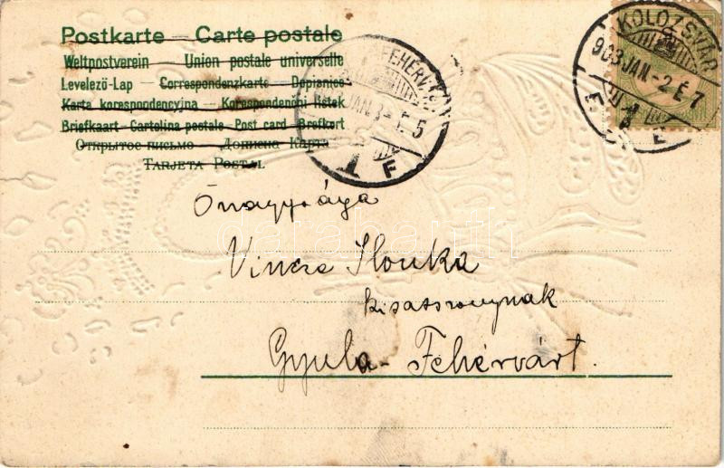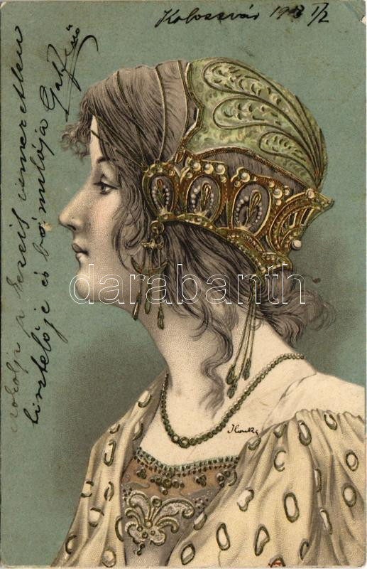 Beschreibung: 1903 Art Nouveau lady. Emb. litho (EK)