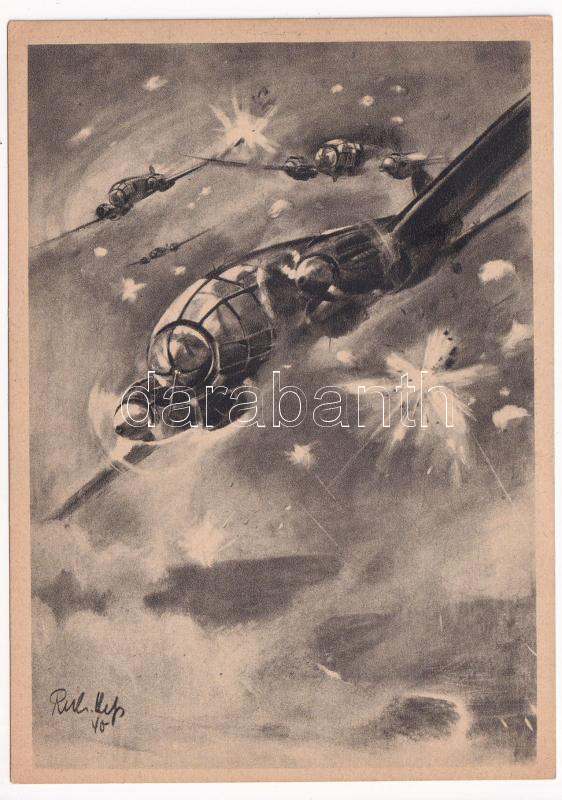 Heinkel-Kampfflugzeuge stossen durch das Sperrfeuer englischer Flakbatterien. Der Adler die grosse Luftwaffen-Illustrierte / German WWII military aircraft / Német második világháborús katonai repülőgép s: R. Hess (fa)