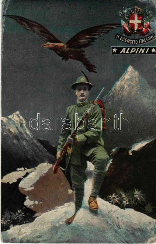 Beschreibung: 1915 Alpini. R. Esercito Italiano / WWI Italian military art postcard, mountain infantry, coat of arms (kopott sarkak / worn corners)