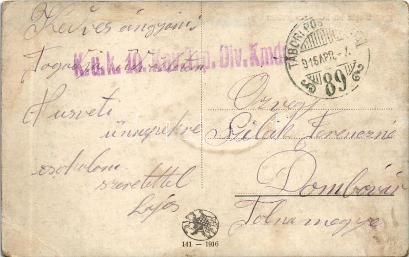 Beschreibung: 1916 Siesta in Schützengraben / Pihenő a lövészárokban / WWI K.u.k. military art + "K.u.k. 10. Kav. Trp. Div. Kmdo." + "TÁBORI POSTAHIVATAL 89" (EB)
