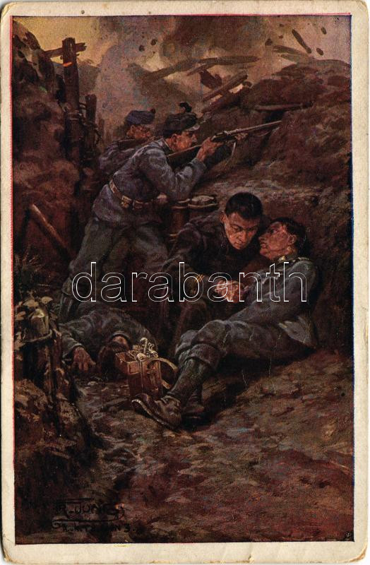 1918 Feldkurat Emil Boscarelli erteilt |ahrend des Kampfes der Landesschützen vom Trientner Regiment, selbts schon schwer verwundet, einem sterbenden Soldaten, nachdem er ihm Samariterdienste geleistet hatte, den letzten geistlichen Zuspruch. Aus dem goldenen Buche der Armee Serie V. Offizielle Karte für Rotes Kreuz, Kriegsfürsorgeamt, Kriegshilfsbüro Nr. 575. / WWI Austro-Hungarian K.u.K. military art postcard s: Fr. Jung (EK)