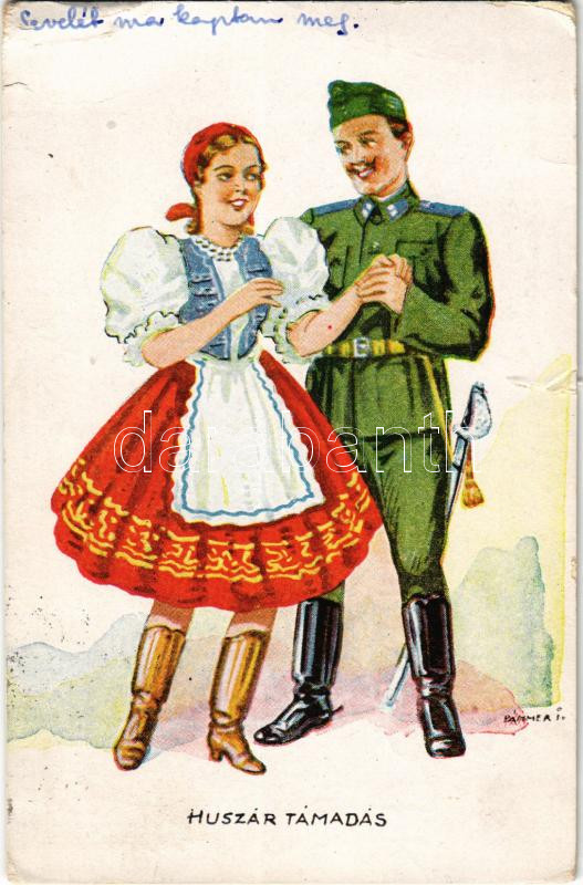 Beschreibung: 1942 Huszár támadás / WWII Hungarian military humour art postcard, hussar flirting with lady s: Pammer (szakadások / tears)