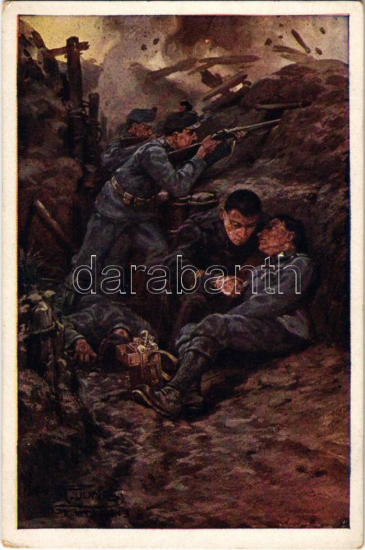 Feldkurat Emil Boscarelli erteilt |ahrend des Kampfes der Landesschützen vom Trientner Regiment, selbts schon schwer verwundet, einem sterbenden Soldaten, nachdem er ihm Samariterdienste geleistet hatte, den letzten geistlichen Zuspruch. Aus dem goldenen Buche der Armee Serie V. Offizielle Karte für Rotes Kreuz, Kriegsfürsorgeamt, Kriegshilfsbüro Nr. 575. / WWI Austro-Hungarian K.u.K. military art postcard s: Fr. Jung (EK)