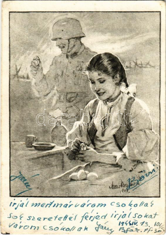 Második világháborús magyar katona és tojásfestő leány. Húsvét / WWII ... https://www.darabanth.com/de/433-Fernauktion/433.0/Ansichtskarten/Militaria~1500058/Masodik-vilaghaborus-magyar-katona-es-tojasfesto-leany-Husvet-WWII-Hungarian-military-E~II2793229