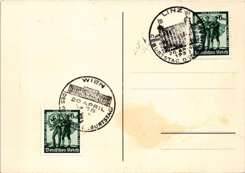 Beschreibung: 1938 Linz, Der Hohe Schrumm + "Des Führers Geburtstag 20. April 1938 Wien" "Geburtstag des Führers 20. April 1938 Linz" So. Stpl. (fl)