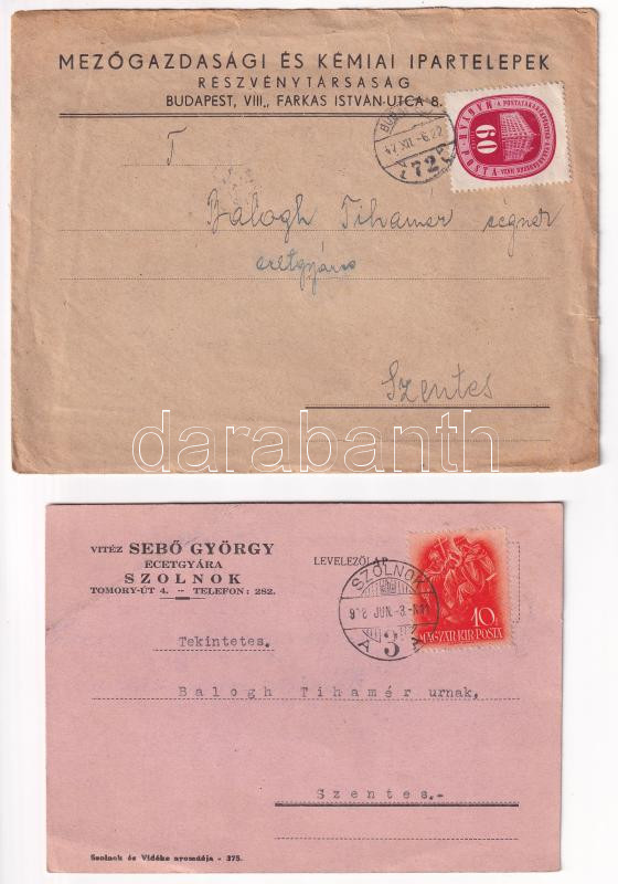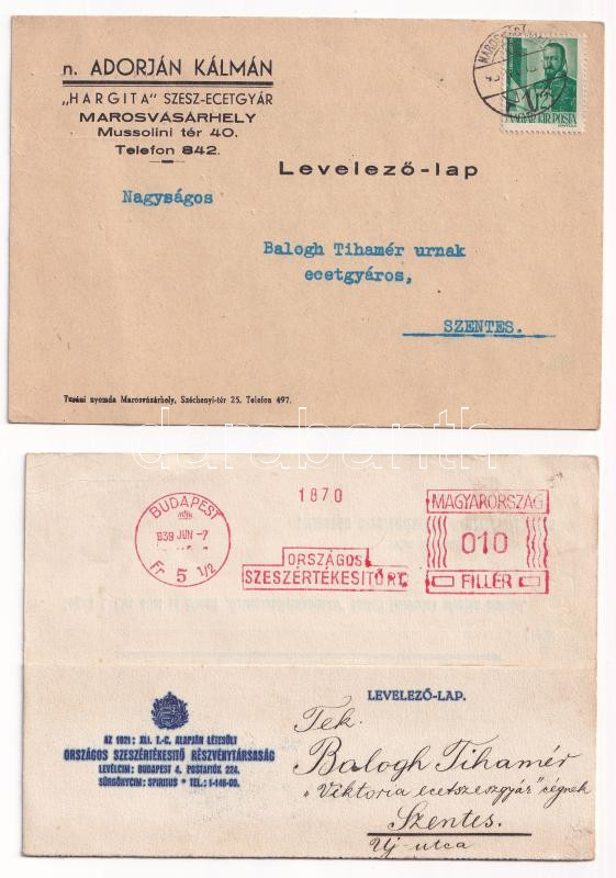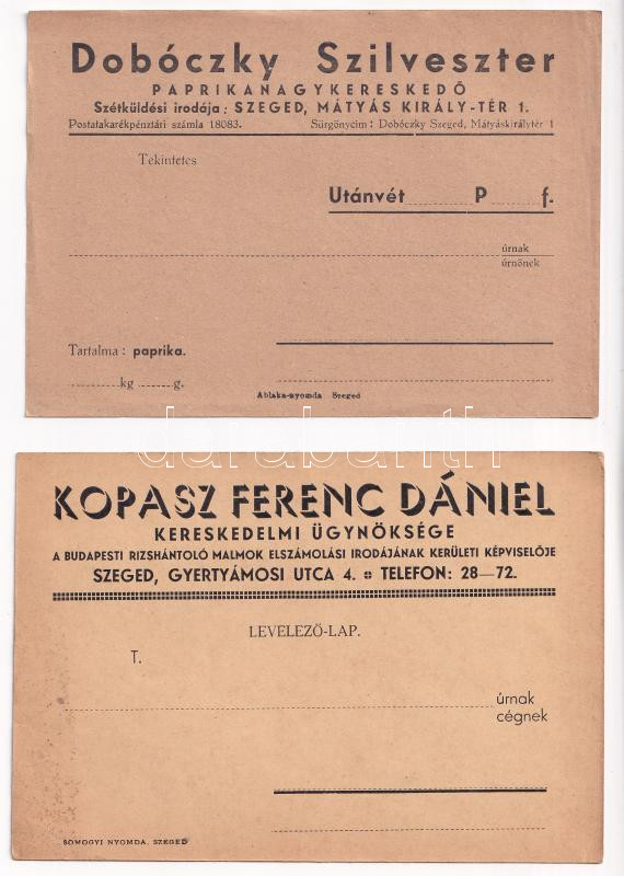 6 db vegyes magyar reklám képeslap, levelezőlap és boríték: Vitéz Sebő György ecetgyára Szolnokon, Adorján Kálmán "Hargita" szesz-ecetgyára Marosvásárhelyen, Mezőgazdasági és Kémiai Ipartelepek, Kopasz Ferenc Dániel kereskedelmi ügynöksége Szegeden, Dobóczky Szilveszter paprikanagykereskedő Szegeden, Országos Szeszértékesítő Részvénytársaság