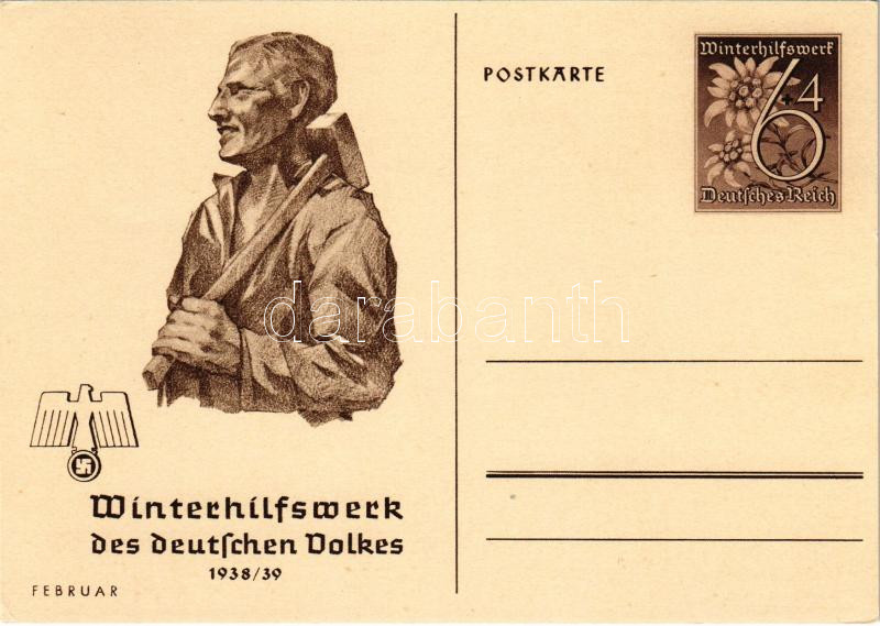 Beschreibung: Winterhilfswerk (WHW) des deutschen Volkes 1938-39 Februar / "Winter Relief of the German People" NSDAP Nazi Party propaganda, working class, swastika; 6+4 Ga. (EK)