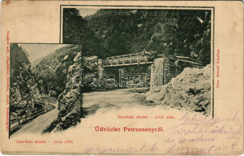 1901 Petrozsény, Petrosani; Szurduki szoros árvíz előtt és után, híd. Honisch udvari fényképész felvétele, Herz Arnold kiadása / gorge and bridge before and after the flood