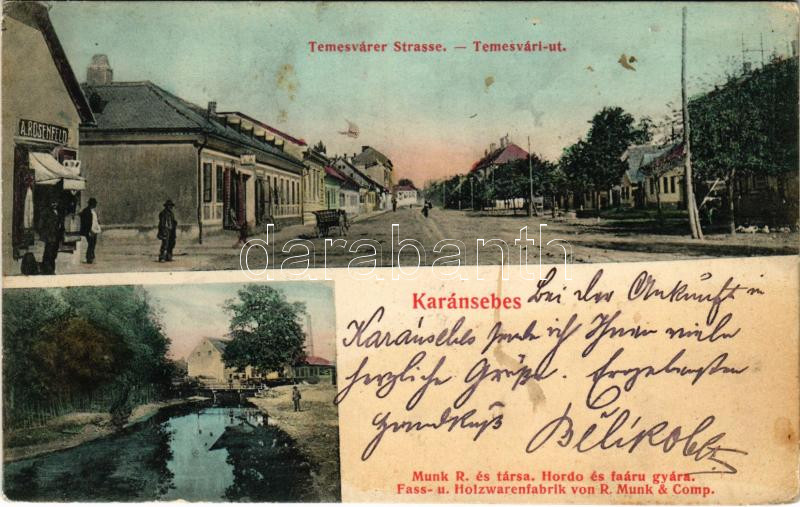 1909 Karánsebes, Caransebes; Temesvárer Strasse, Fass- u. Holzwarenfabrik v. R. Munk & Comp. / Temesvári út, A. Rosenfeld üzlete, Munk R. és Társa Hordó- és faárugyára. H. Rosenfeld kiadása / street view, wooden barrel factory (EK)