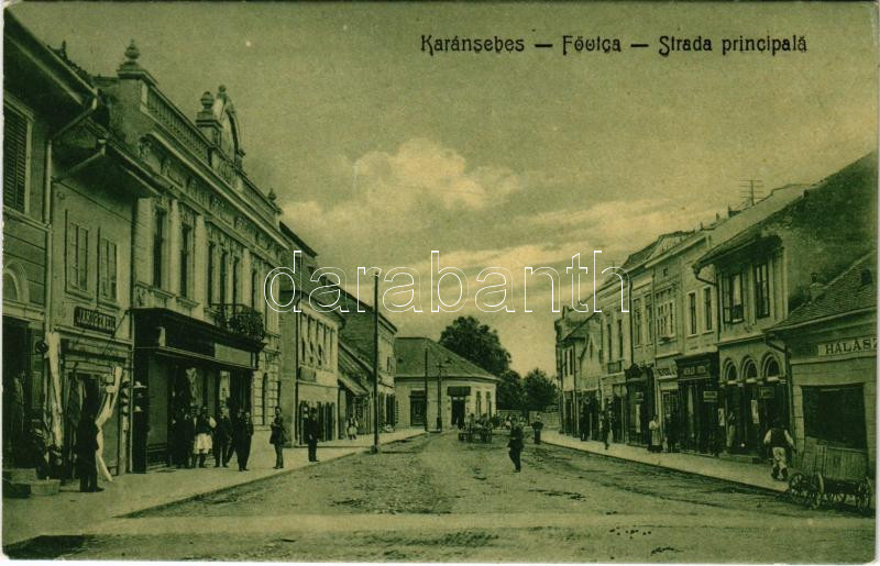 1910 Karánsebes, Caransebes; Fő utca, Jakob Zweig, Halász, Mehler Róza, Révész üzlete. W.L. 1475. / Hauptgasse / Strada principala / main street, shops
