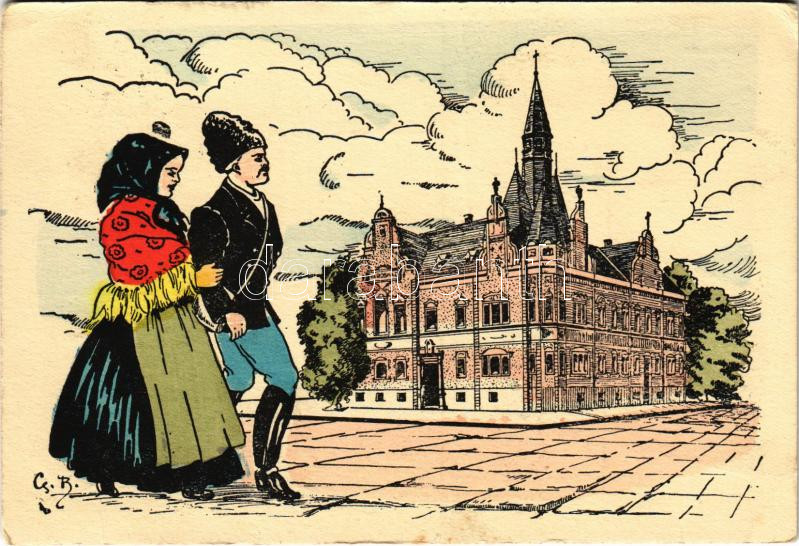 1939 Karánsebes, Caransebes; Városháza. Kiadja a Délvidéki Egyetemi és Főiskolai Hallgatók Egyesülete / town hall, Transylvanian folklore, traditional costumes s: Cs. B. (EK)