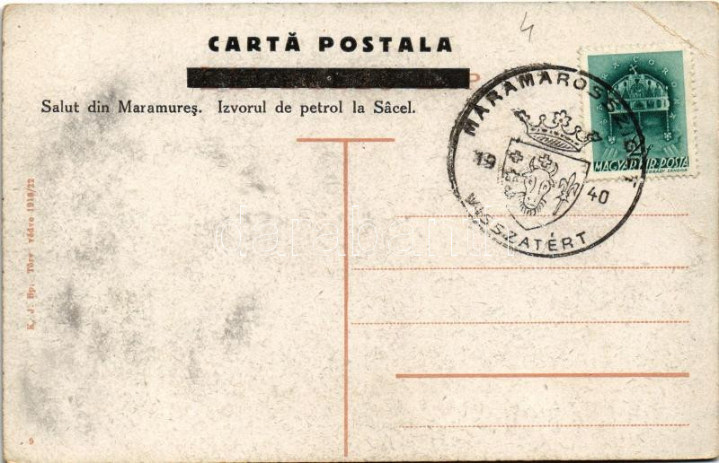 Beschreibung: Izaszacsal, Sacel (Máramaros); Petróleum forrás, olajmező / Izvorul de petrol / oil well, oil plant + "1940 Máramarossziget visszatért" So. Stpl. (EB)