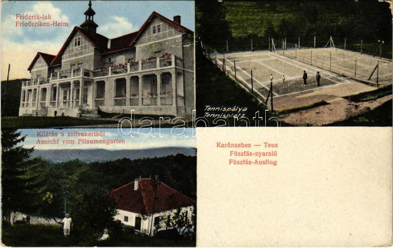 Karánsebes, Caransebes; Friderik-lak, kilátás a Szilva kertből, tenisz pálya. Füszfás Sándor kiadása, hátoldalon reklám magyar, német és román nyelven / villa, tennis court. Advertisement on the backside in Hungarian, Romanian and German (gyűrődés / crease)