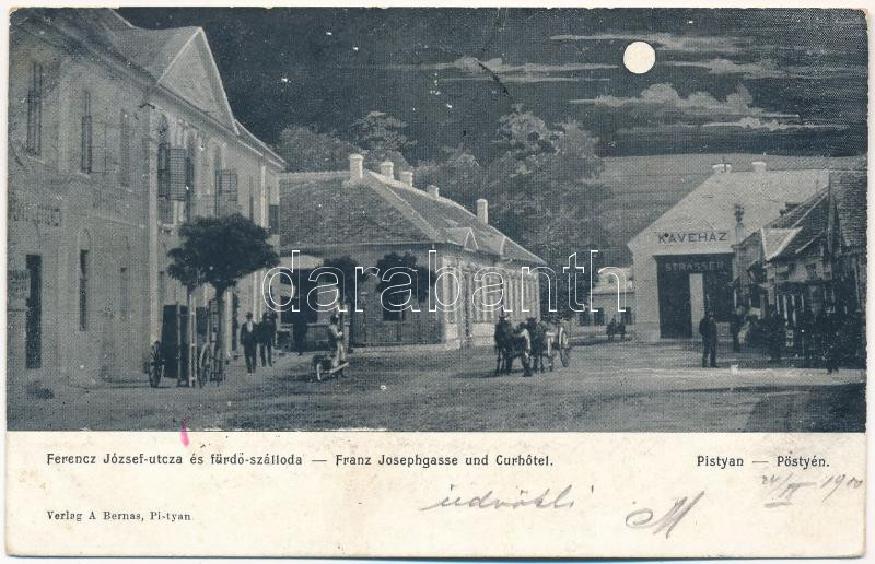 1900 Pöstyén, Piestany; Ferenc József utca és fürdő szálloda, Strasser... https://www.darabanth.com/de/433-Fernauktion/433.0/Ansichtskarten/Slowakei~1500008/1900-Postyen-Piestany-Ferenc-Jozsef-utca-es-furdo-szalloda-Strasser-kavehaz-este-A-B~II2795863