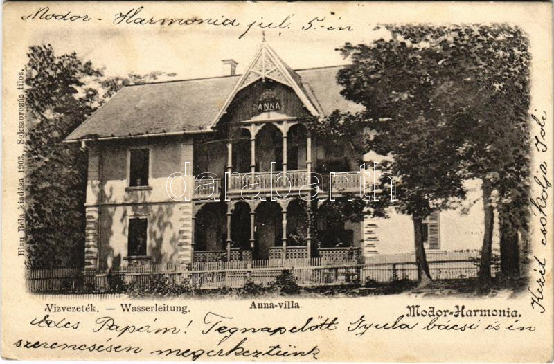 Beschreibung: 1903 Modor-Harmónia, Modra; Anna villa, Vízvezeték. Blau Béla kiadása / villa, Wasserleitung (EK)