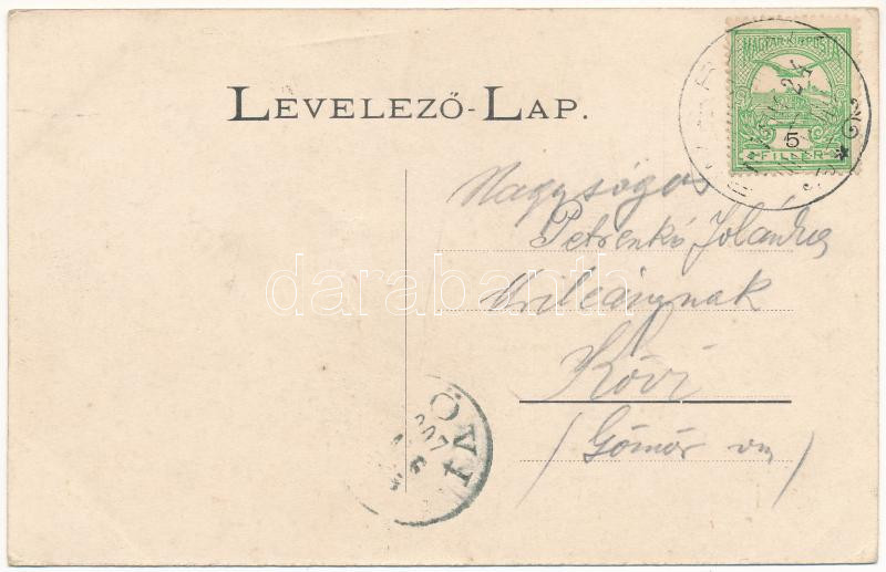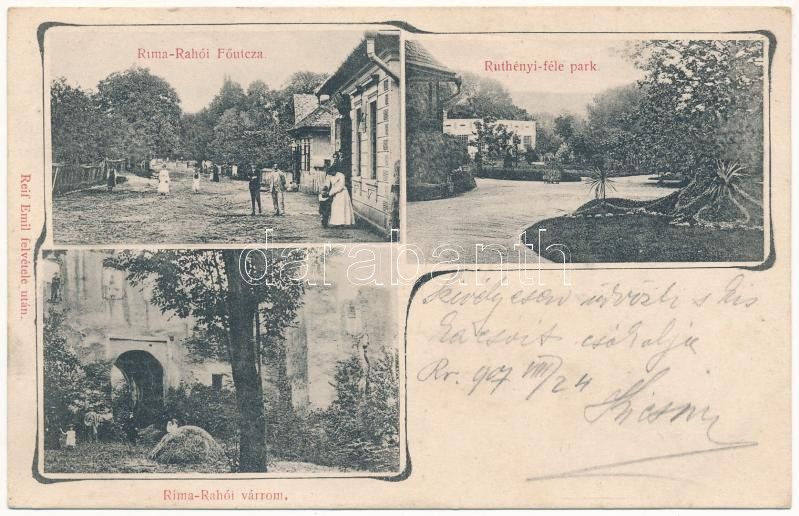 1907 Rimaráhó, Rima-Rahó, Hrachovo; Fő utca, üzlet, Ruthényi kastély parkja, várrom. Reif Emil felvétele után / main street, castle park, castle ruins. Art Nouveau (gyűrődés / crease)