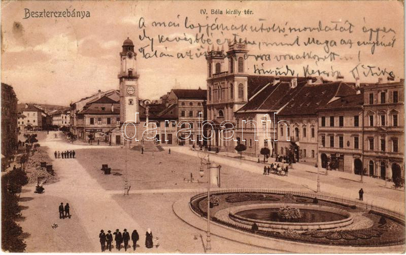 1910 Besztercebánya, Banská Bystrica; IV. Béla király tér, Városháza, Ehrenwald Gyula, Strelinger Jakab, Schäffer J. József üzlete. Sonnenfeld Mór kiadása / square, town hall, shops (EK)