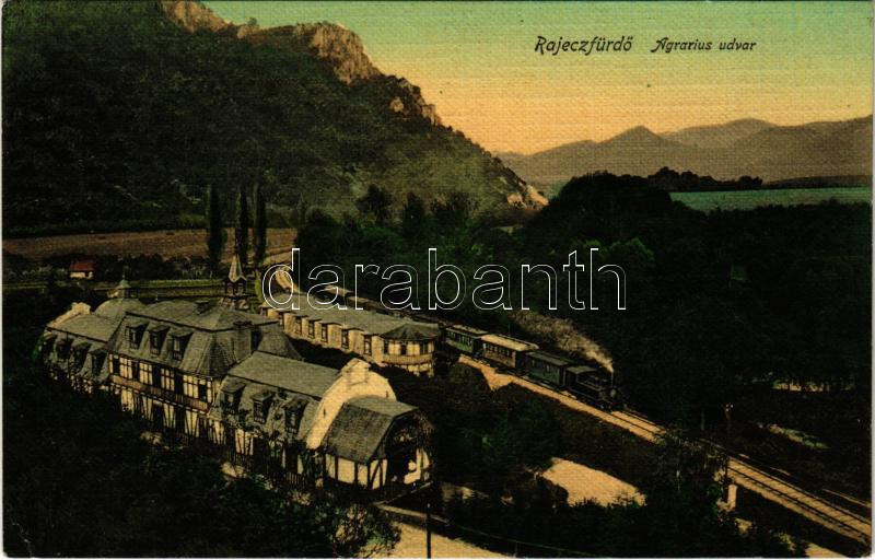 Beschreibung: 1910 Rajecfürdő, Rajecz-fürdő, Rajecké Teplice; Agrarius udvar, gőzmozdony, vonat / hotel, locomotive, train (EK)
