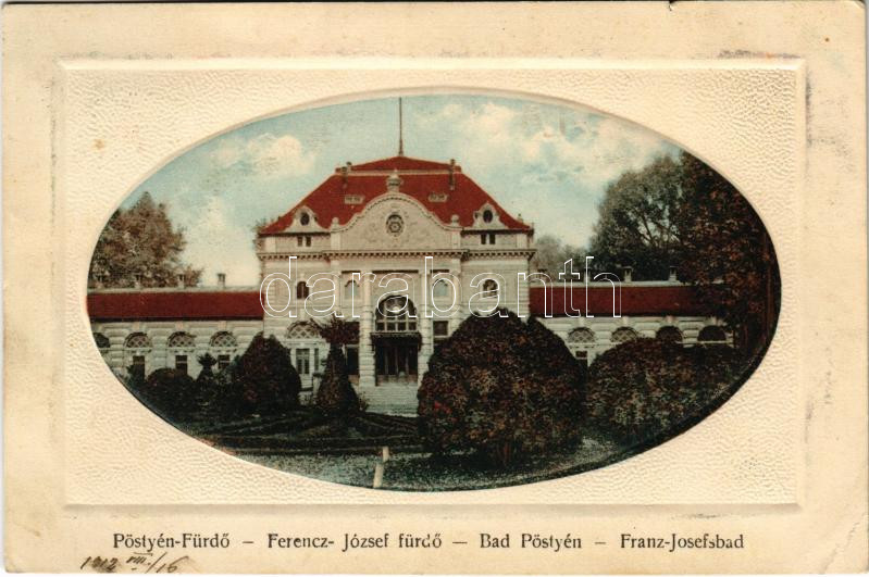 1912 Pöstyén, Pistyan, Piestany; Ferenc József fürdő. Laufer Nándor ki... https://www.darabanth.com/de/433-Fernauktion/433.0/Ansichtskarten/Slowakei~1500008/1912-Postyen-Pistyan-Piestany-Ferenc-Jozsef-furdo-Laufer-Nandor-kiadasa-Franz-Josefsbad~II2792308