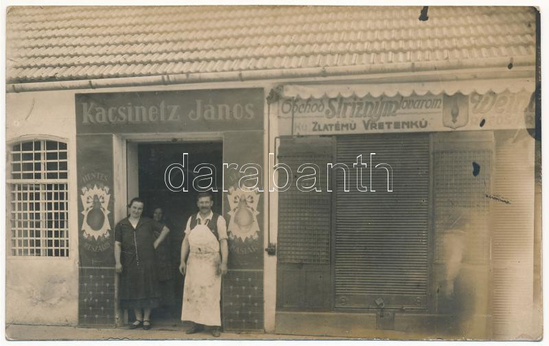 Beschreibung: 1912 Pozsony, Pressburg, Bratislava; Kacsinetz János és Weinb. üzlete / Obchód Striznym továrom Ku: Zlatémú Vretenkú / shops. photo