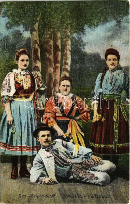 Beschreibung: 1916 Pöstyén-fürdő, Kúpele Piestany; népviselet. Donáth Lipót kiadása / Volkstracht / folklore (szakadás / tear) + "K.u.k. Militärstationskommando in Pöstyén"