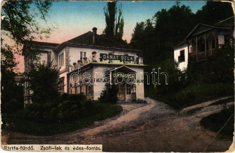 Beschreibung: Bártfa, Bártfafürdő, Bardejovské Kúpele, Bardiov, Bardejov; Zsófi lak és édes-forrás, Danay Béla cukrászdája. Birnbaum kiadása / villa, spring source, confectionery, spa (ázott / wet damage)