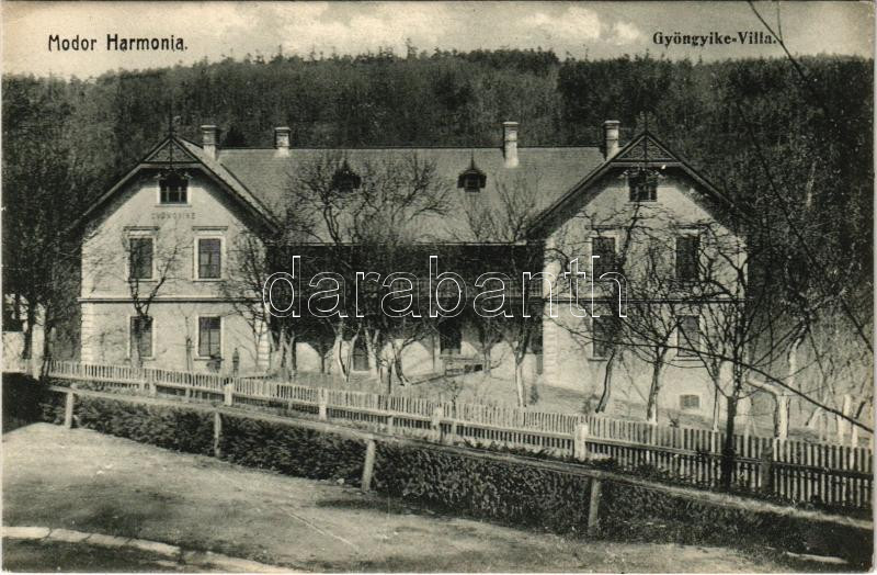 Modor-Harmónia, Modra; Gyöngyike Villa https://www.darabanth.com/de/433-Fernauktion/433.0/Ansichtskarten/Slowakei~1500008/Modor-Harmonia-Modra-Gyongyike-Villa~II2795722