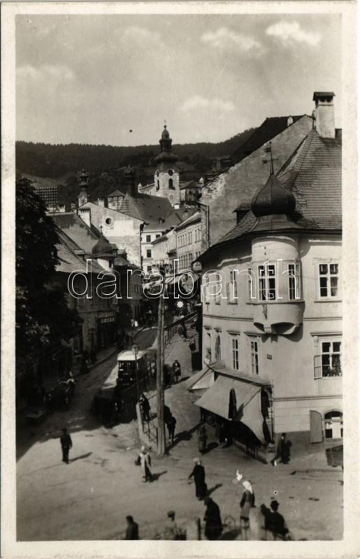 Beschreibung: Selmecbánya, Schemnitz, Banská Stiavnica; tér, autóbusz, gyógyszertár, üzletek / square, autobus, pharmacy, shops