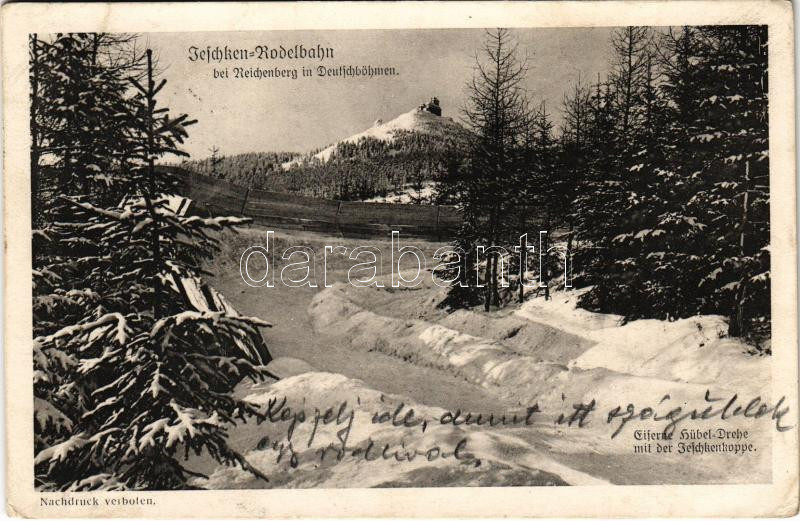 1916 Teschken-Rodelbahn bei Reichenberg (Liberec) in Deutschböhmen. Eiserne Hübel-Drehe mit der Teschkenkoppe / winter sport, toboggan run, sledding (EK)