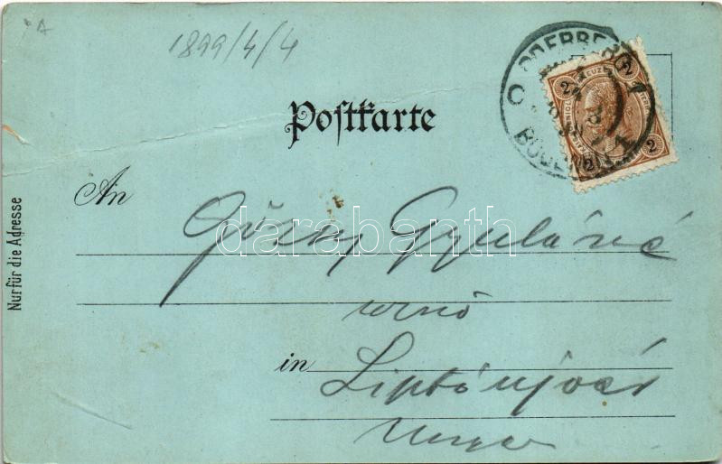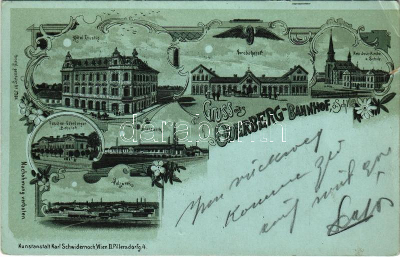 1899 (Vorläufer) Bohumín, Oderberg; Hotel Lustig, Nordbahnhof, Herz-Jesu-Kirche u. Schule, Kaschau-Oderberger Bahnhof, Drahtwerk, Walzwerk / szálloda, vasútállomás, templom és iskola, Kassa-Oderbergi Vasút állomása, drótgyár, hengermalom, iparvasút, vagonok / hotel, railway station, church and school, railway station of Kosice-Bohumín Railway, wire factory, rolling mill, industrial railway, wagons. Kunstanstalt Karl Schwidernoch Art Nouveau, floral, litho (fa)
