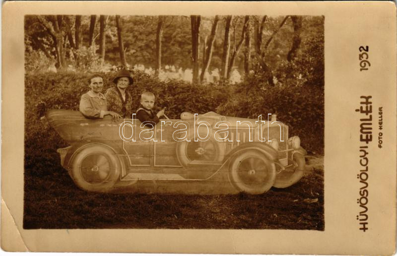 Beschreibung: 1932 Budapest II. Hűvösvölgyi Emlék, humoros csoportkép karton autóval. Foto Keller photo (EK)