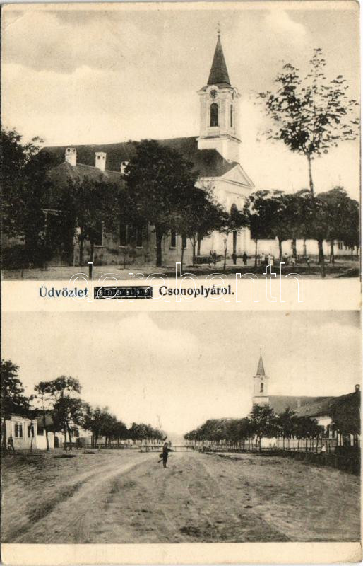 Beschreibung: 1911 Csonoplya, Tschonopel, Conoplja; templom, Fő utca / church, main street (EK)