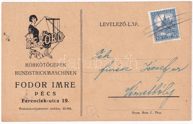 1933 Rekord körkötőgépek. Fodor Imre, Pécs, Ferenciek utca 19. reklám ... https://www.darabanth.com/de/433-Fernauktion/433.0/Ansichtskarten/Werbungen~1500075/1933-Rekord-korkotogepek-Fodor-Imre-Pecs-Ferenciek-utca-19-reklam-Rundstrickmaschinen-E~II2797430