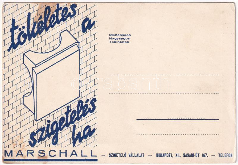 Beschreibung: Tökéletes a szigetelés ha Marschall. Szigetelő vállalat reklámja. Budapest XI. Sasadi út 167. / Hungarian insulation company advertisement card (fl)