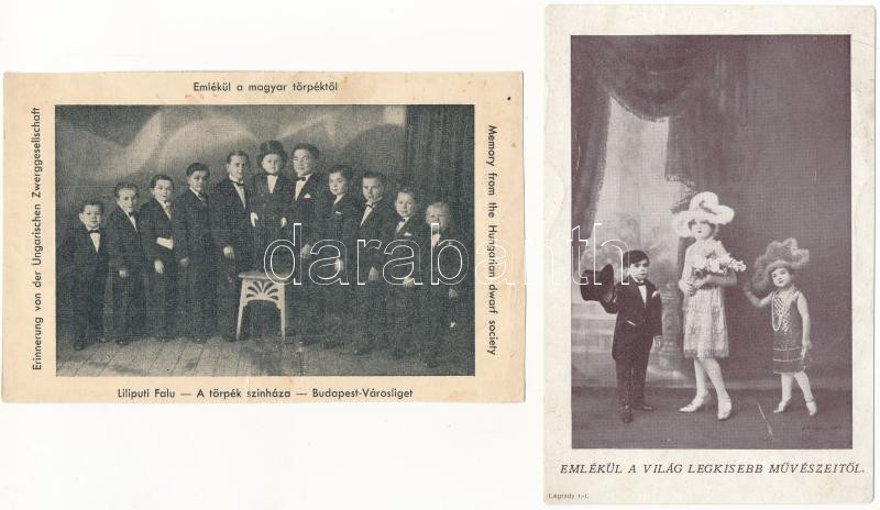4 db RÉGI motívumlap: cirkuszi akrobaták, magyar törpék, Liliputi Falu; vegyes minőségben / 4 pre-1945 motive cards: circus acrobats, Hungarian dwarves; in mixed quality