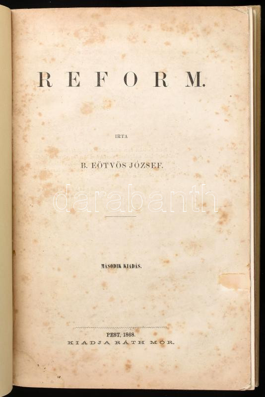 B. Eötvös József: Reform. Pest, 1868., Ráth Mór, (Kocsi Sándor-ny.), 6+228 p. Második kiadás. Átkötött modern kartonált papírkötésben, foltos lapokkal. A szerző Széchenyi és Kossuth vitájában az utóbbi pártjára állt. Amikor a Pesti Hirlap főszerkesztője barátja, Szalay László lett, itt jelentette meg a parlamentáris kormányzás mellett érvelő cikksorozatát. Ezeket foglalta egybe önállóan e kötetben.