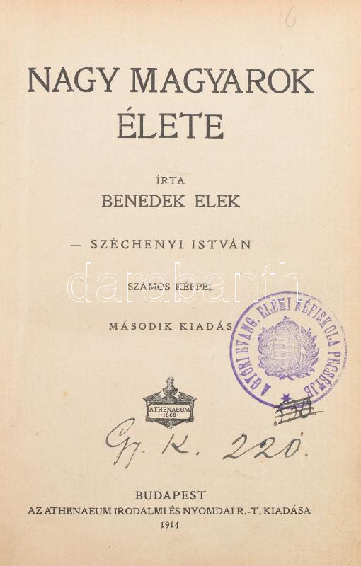 Benedek Elek: Nagy magyarok élete. Széchenyi István. Számos képpel. Bp., 1914., Athenaeum, 180 p. Második kiadás. Kiadói aranyozott, festett, illusztrált egészvászon-kötés, kissé kopott borítóval, intézményi bélyegzővel.