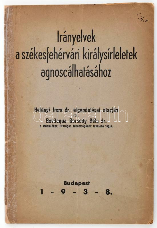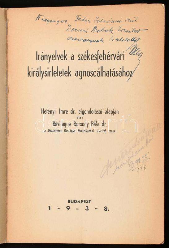 Bevilagua Borsody Béla: Irányelvek a székesfehárvári királysírleletek agnoscálhatásához. DEDIKÁLT! Bp., 1938., (Sopron, Rábaközi-ny.), 49 p. Különlenyomat. Kiadói papírkötés, javított gerinccel, javított, szakadozott borítóval, lapszéli szakadásokkal.