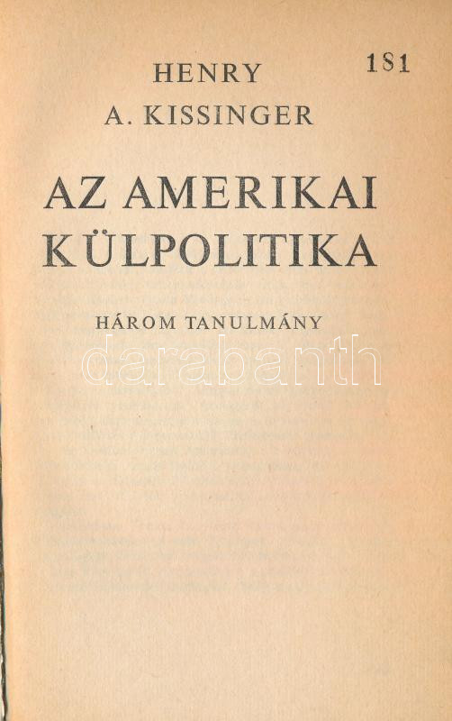 Henry A. Kissinger: Az amerikai külpolitika. Három tanulmány. h.n. ,é.n., k.n.,145+1 p. Számozott, 181. számú példány. Kiadói papírkötésben.